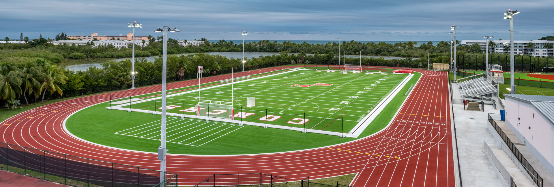 The installation included a multi-purpose Matrix Helix® turf game field and Major Play® Matrix Helix turf softball field. Both fields include a Cushdrain® shock pad and Ecotherm™ infill. In addition to the two synthetic turf fields at Key West High School the team also resurfaced the track and built a 60,000 sq/ft sod practice field.