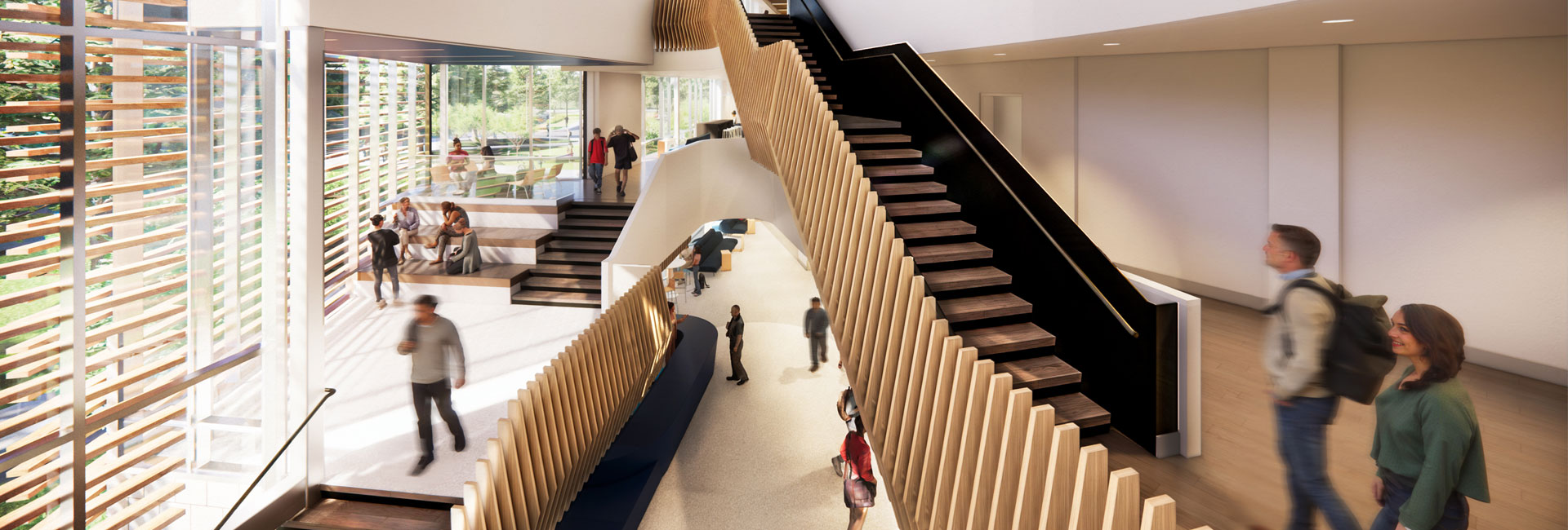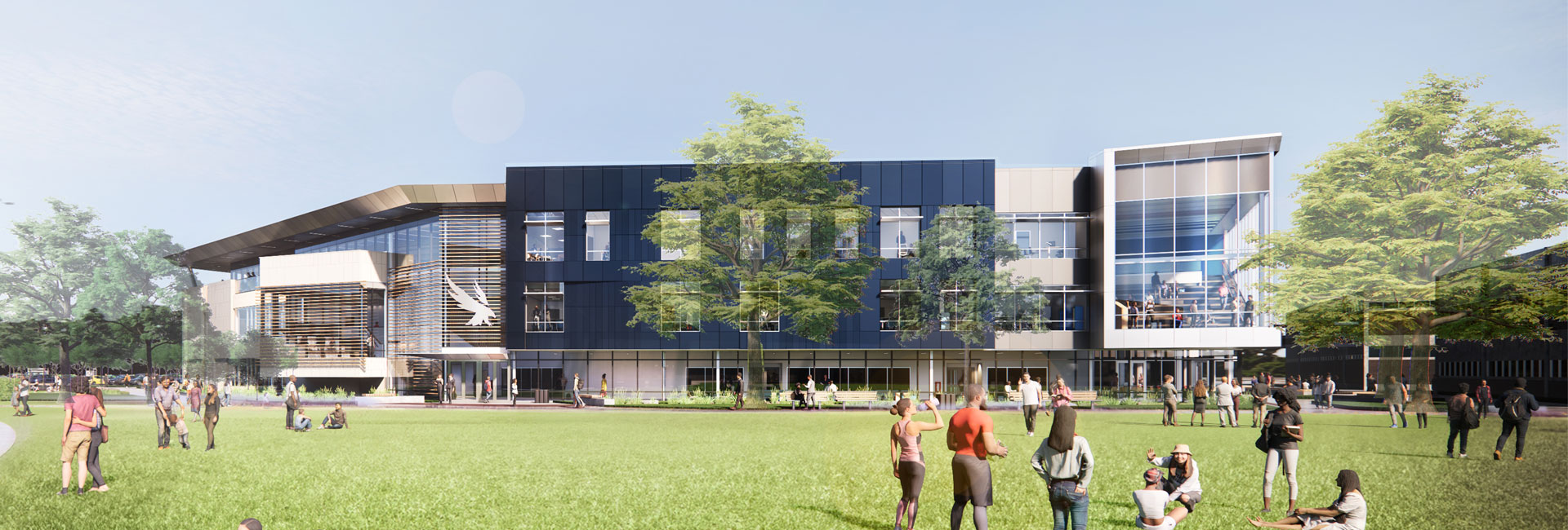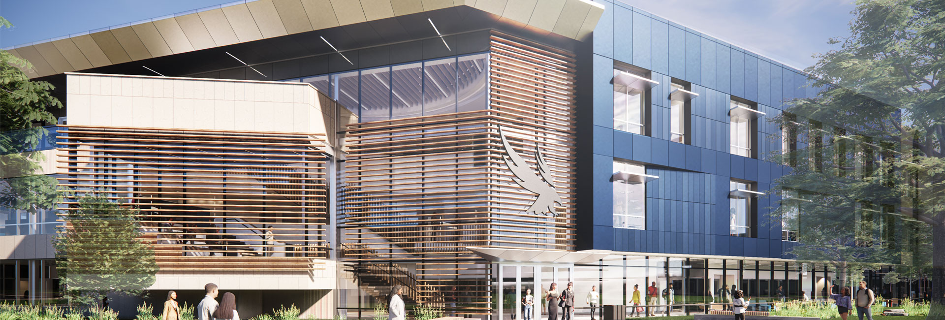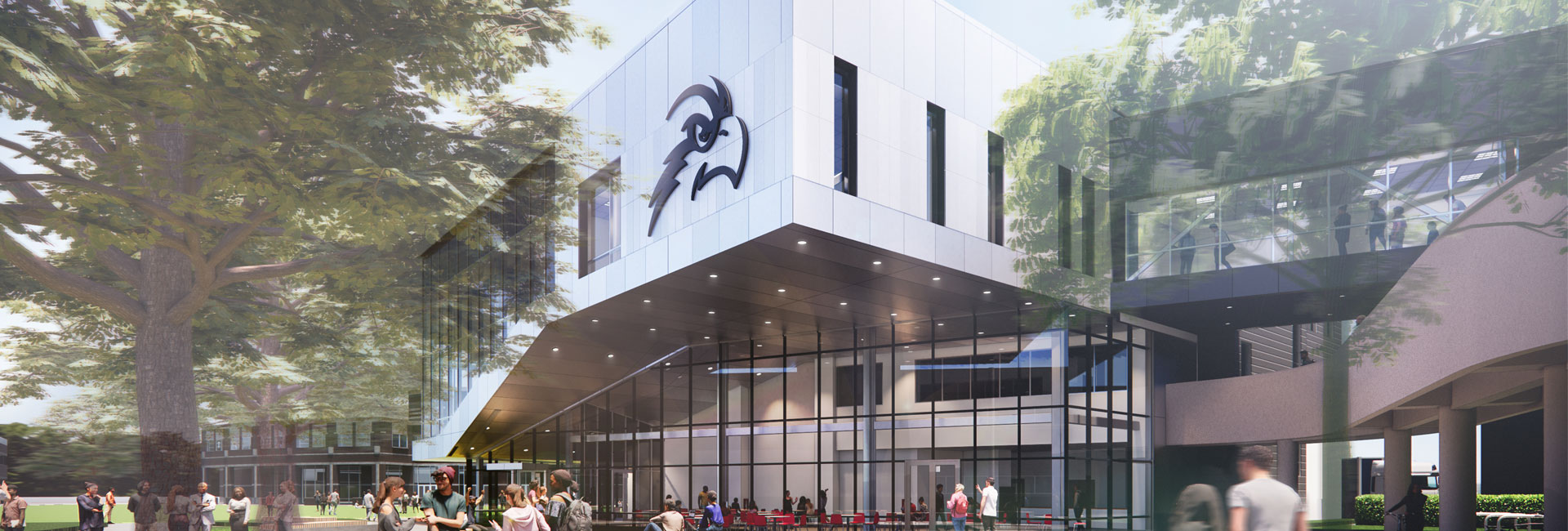 The building exterior borrows from existing campus elements using University branding as well as extending the modern stone aesthetic along the western edge of campus and adjacent to the Carpenter Library. The interior design reflects unique materials and spatial moments reflective of an osprey nest and wing to reinforce the unique biodiversity and wetland habitat of campus.